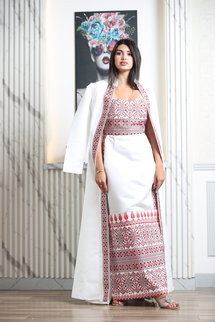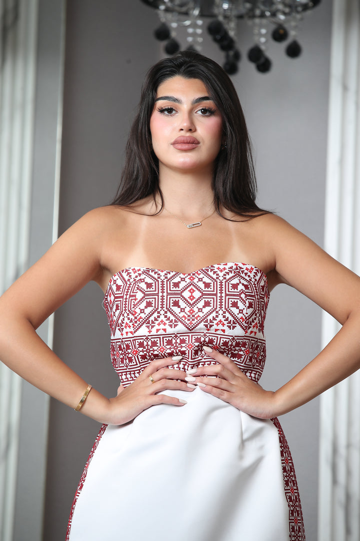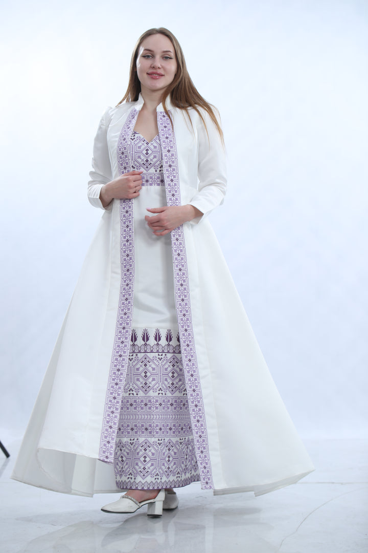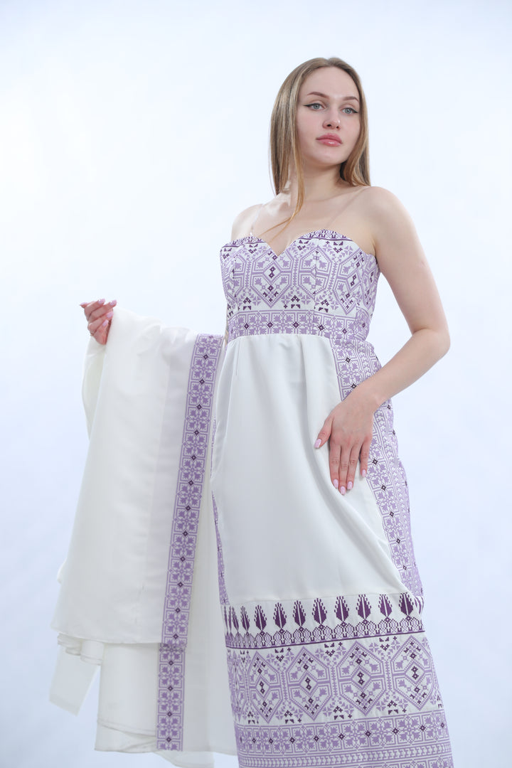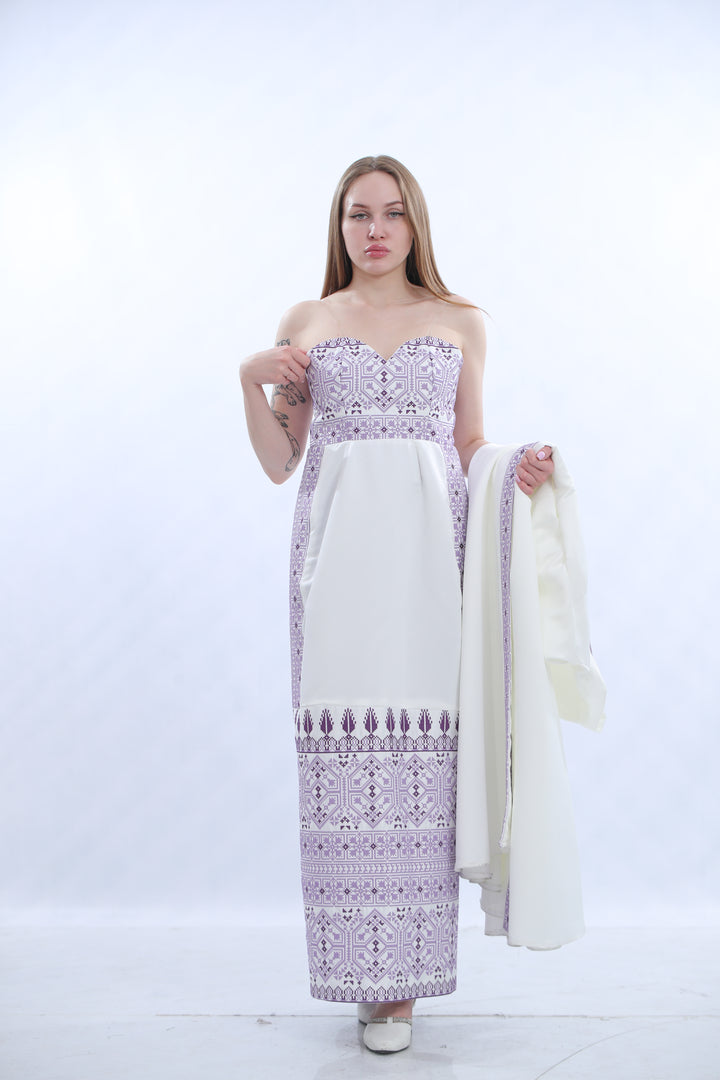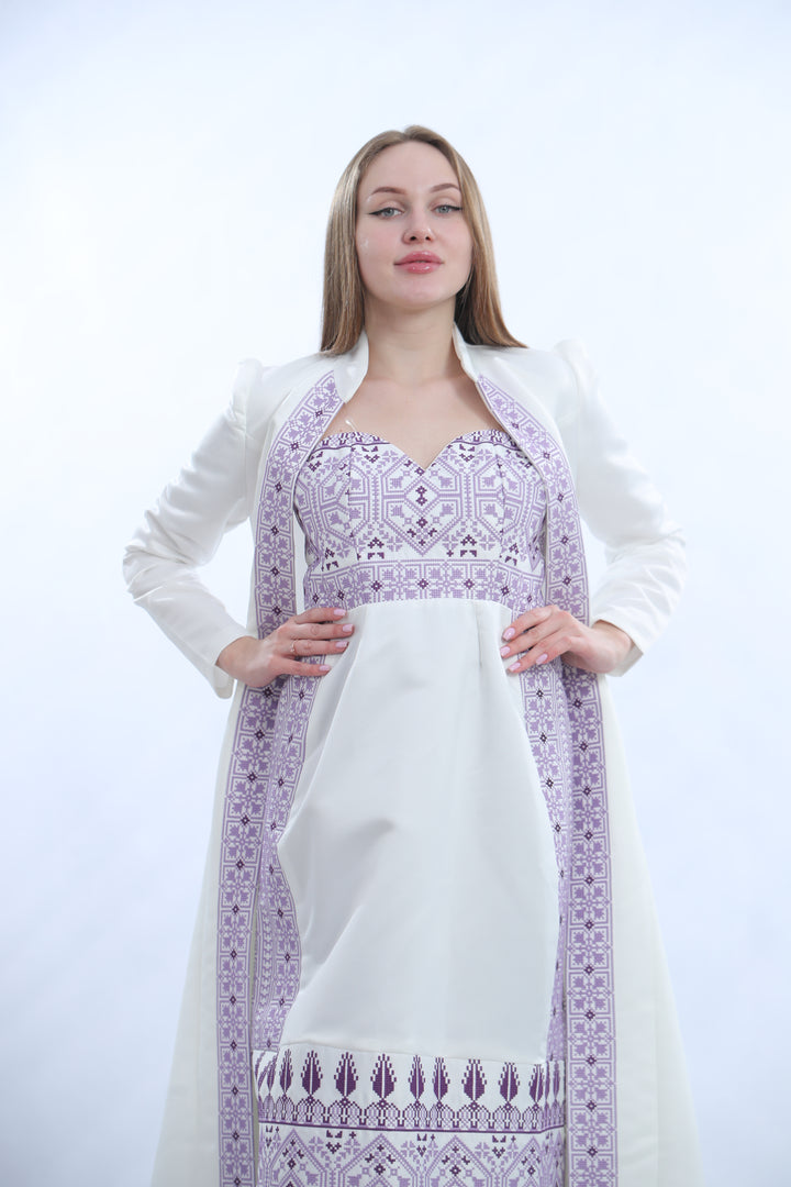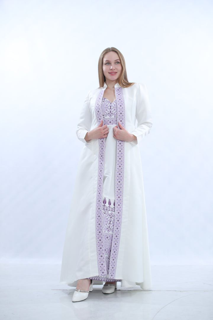 This Embroidered Strapless Lilac Embroidered Dress with Matching Jacket Set #1092 is made in Jordan from the finest silk threads and the best fabrics ( satin Taiwan ). It is a high-end piece of art designed to make you unique at your occasion.
