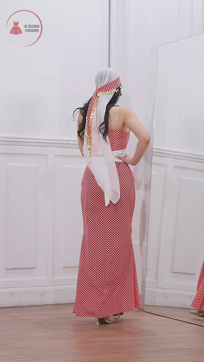 This Embroidered Modern Keffiyeh Dress with Corset Waist + Free Matching Veil #112 is made in Jordan from the finest silk threads and the best fabrics ( satin taiwan ). It is a high-end piece of art designed to make you unique at your occasion.
