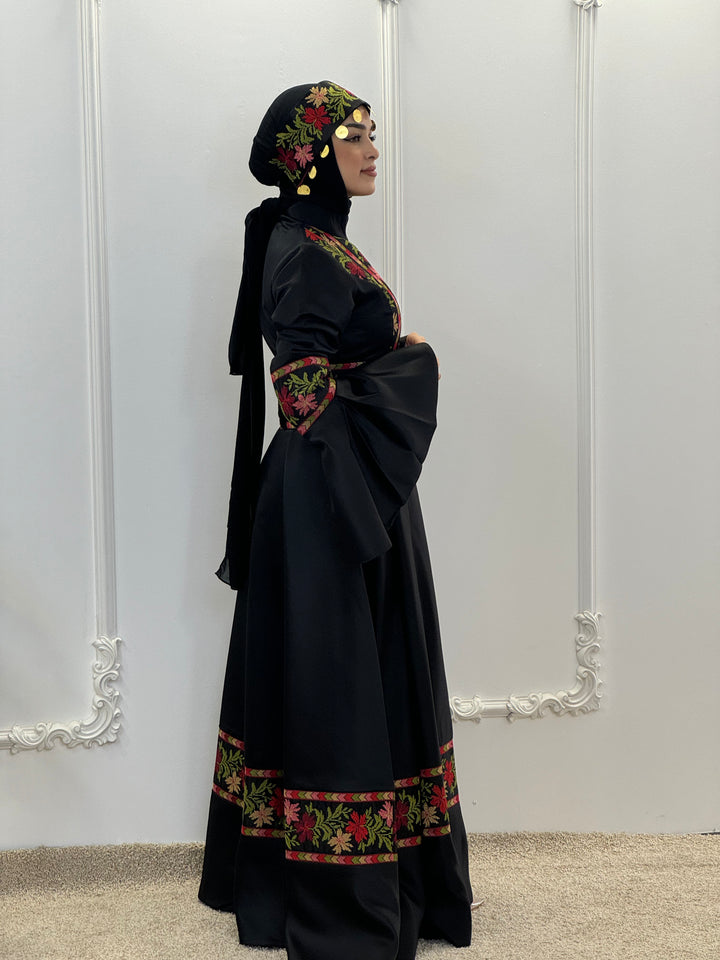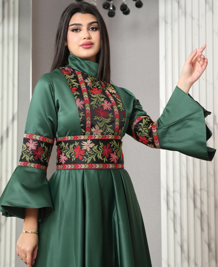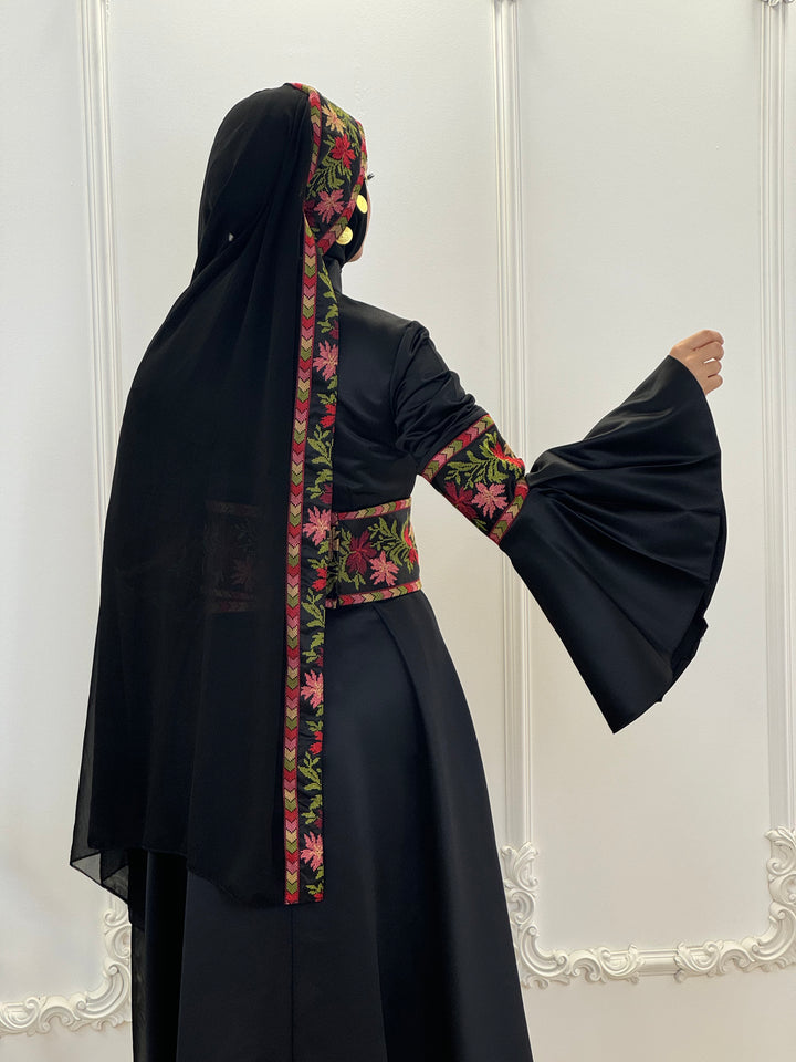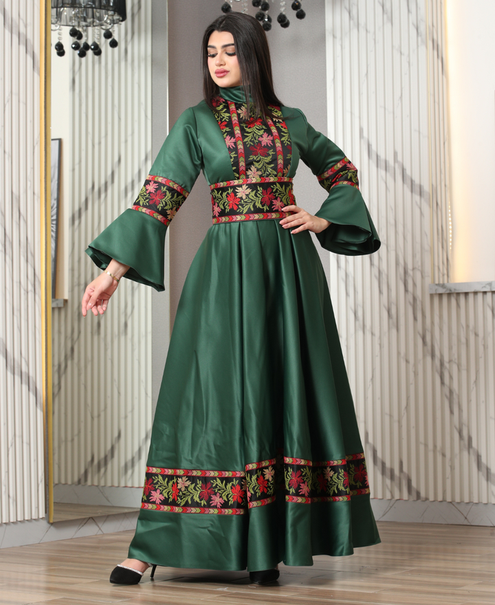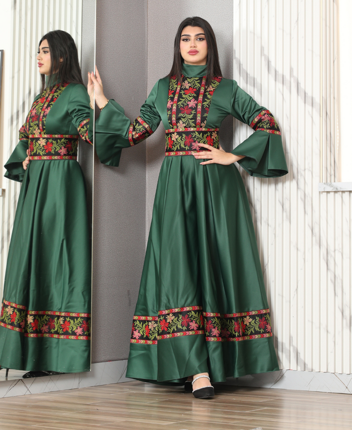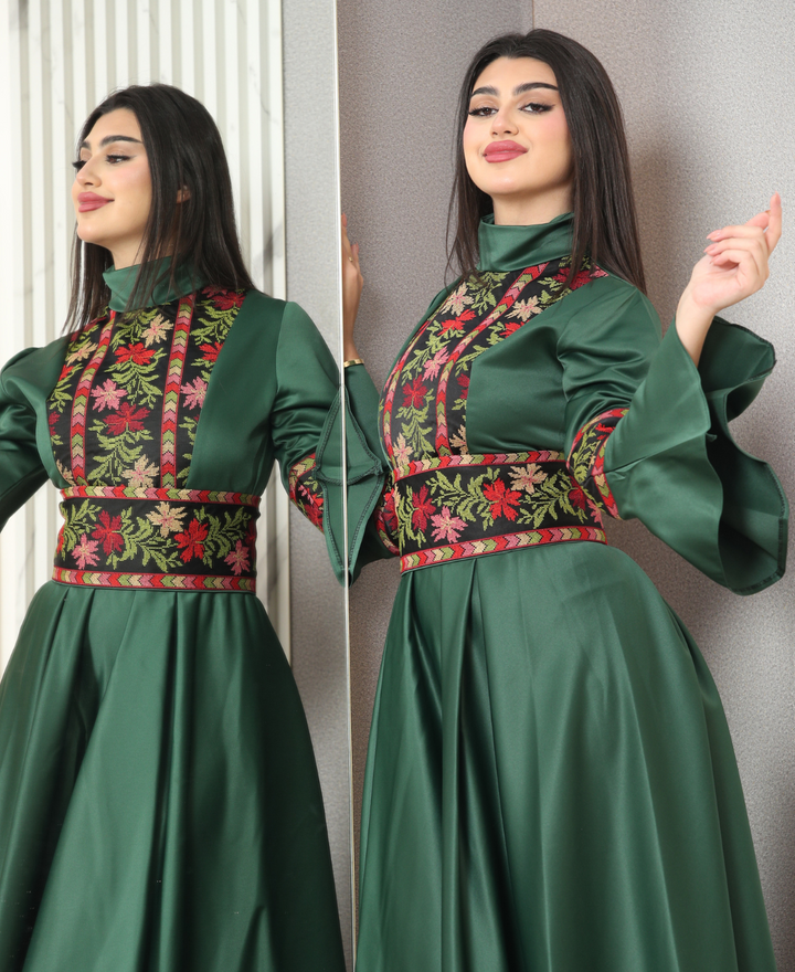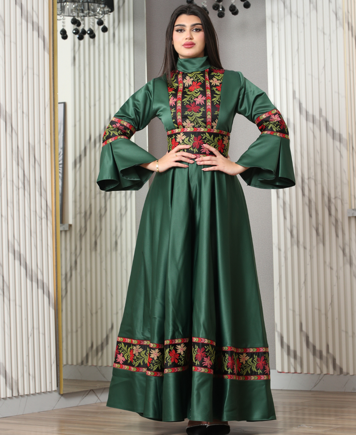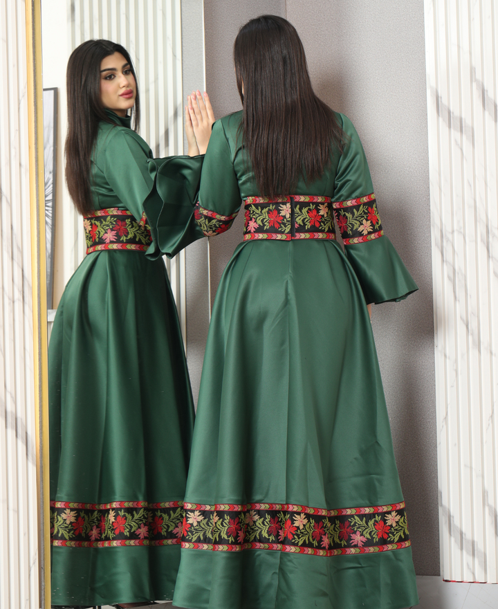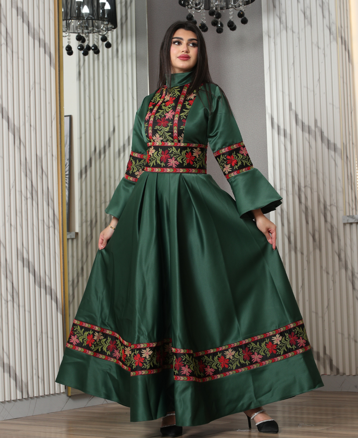 This Embroidered Luxe Cultural Embroidered Dress with Signature Detailing #3 is made in Jordan from the finest silk threads and the best fabrics ( satin taiwan ). It is a high-end piece of art designed to make you unique at your occasion.