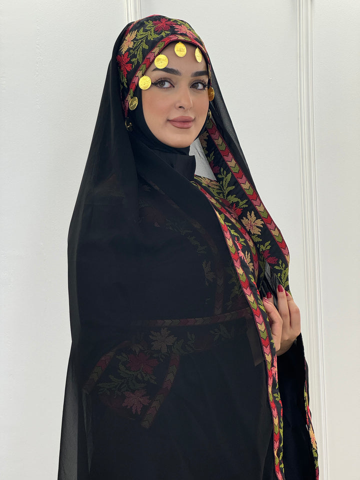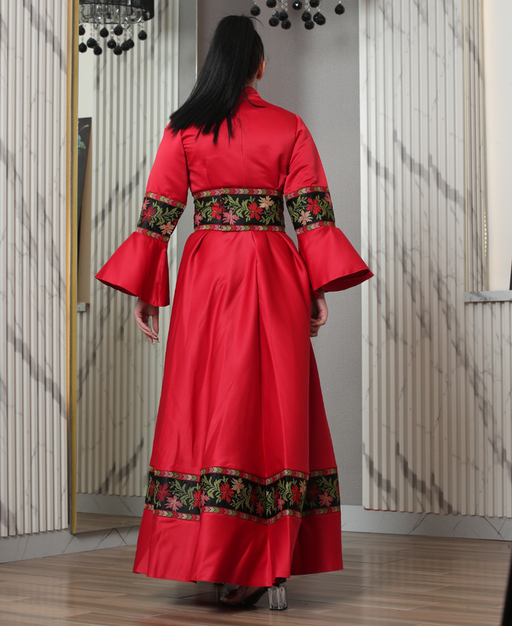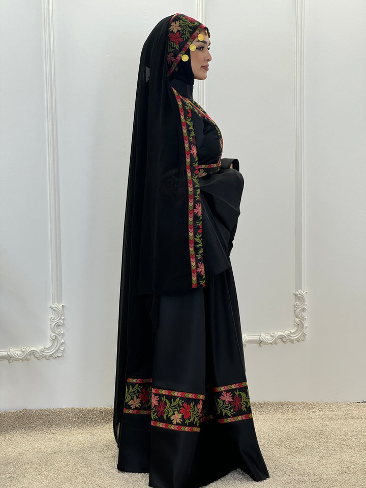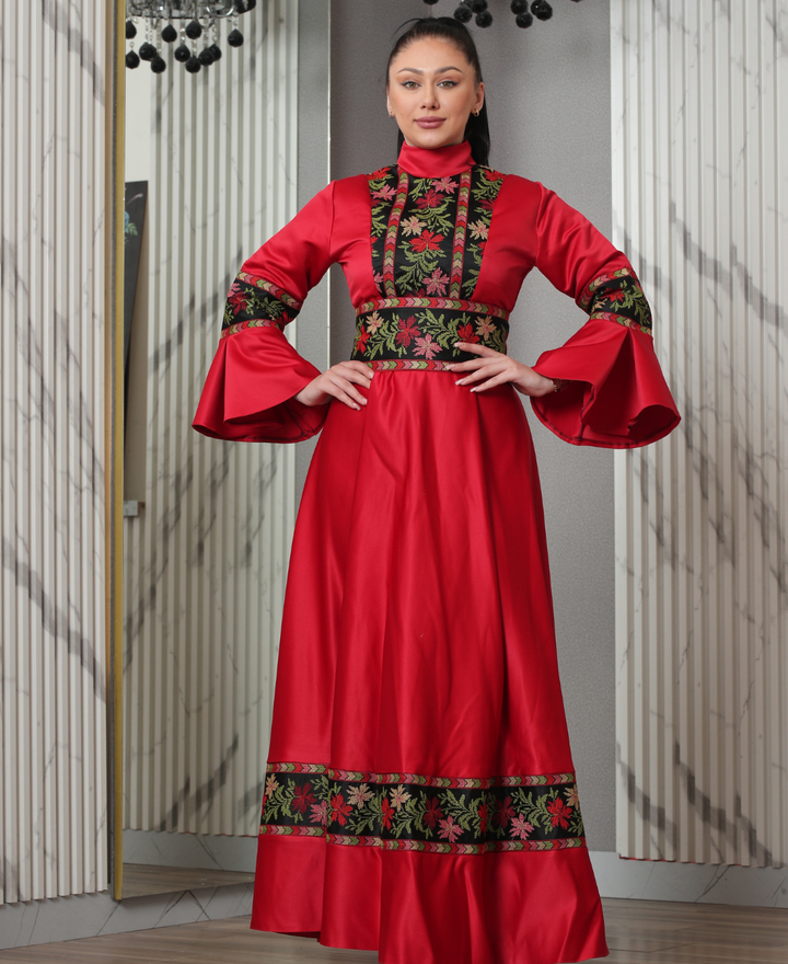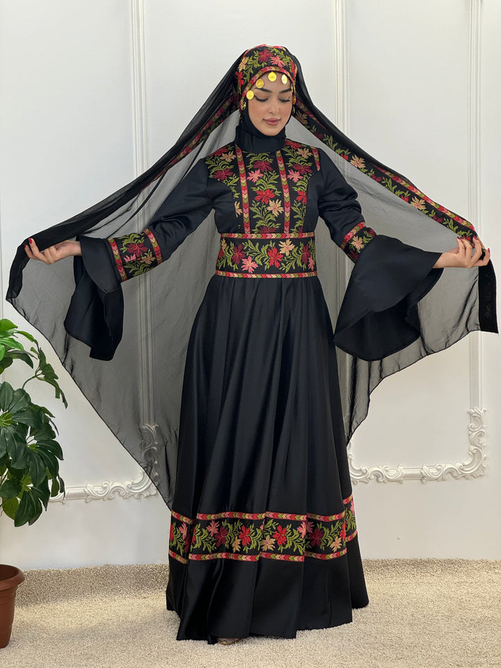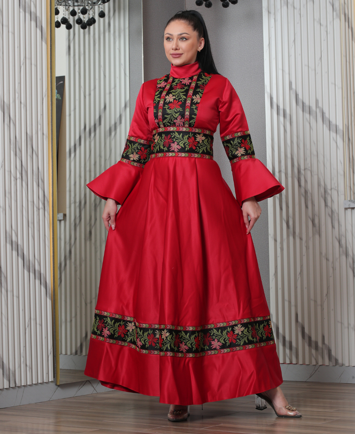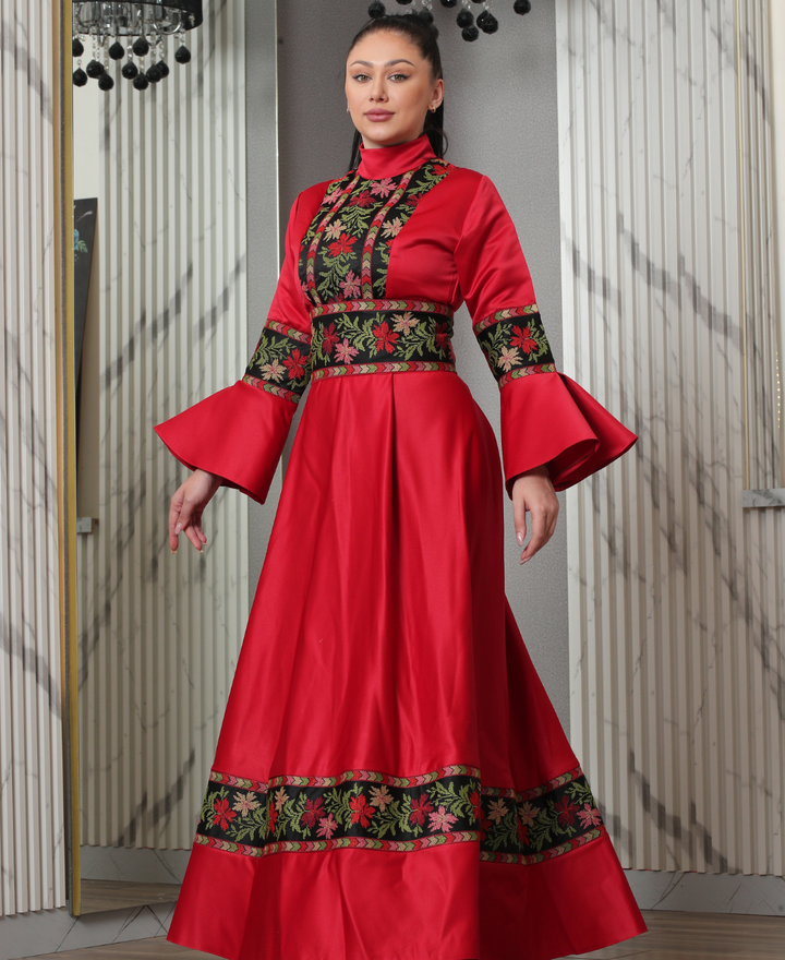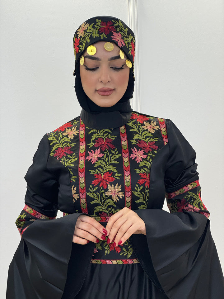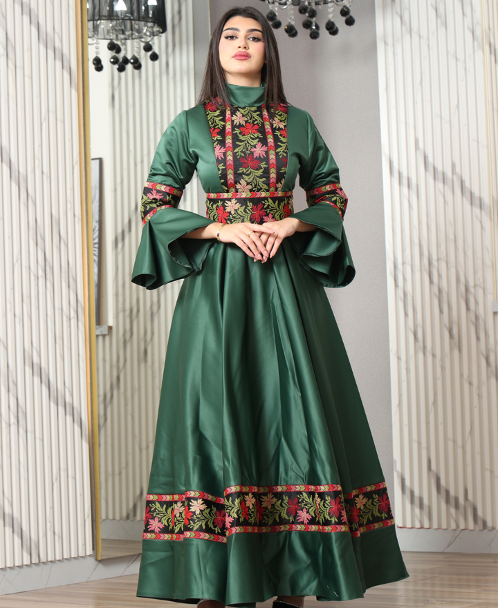 This Embroidered Luxe Cultural Embroidered Dress with Signature Detailing #3 is made in Jordan from the finest silk threads and the best fabrics ( satin taiwan ). It is a high-end piece of art designed to make you unique at your occasion.