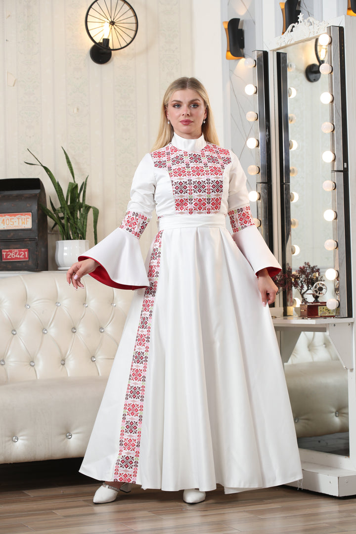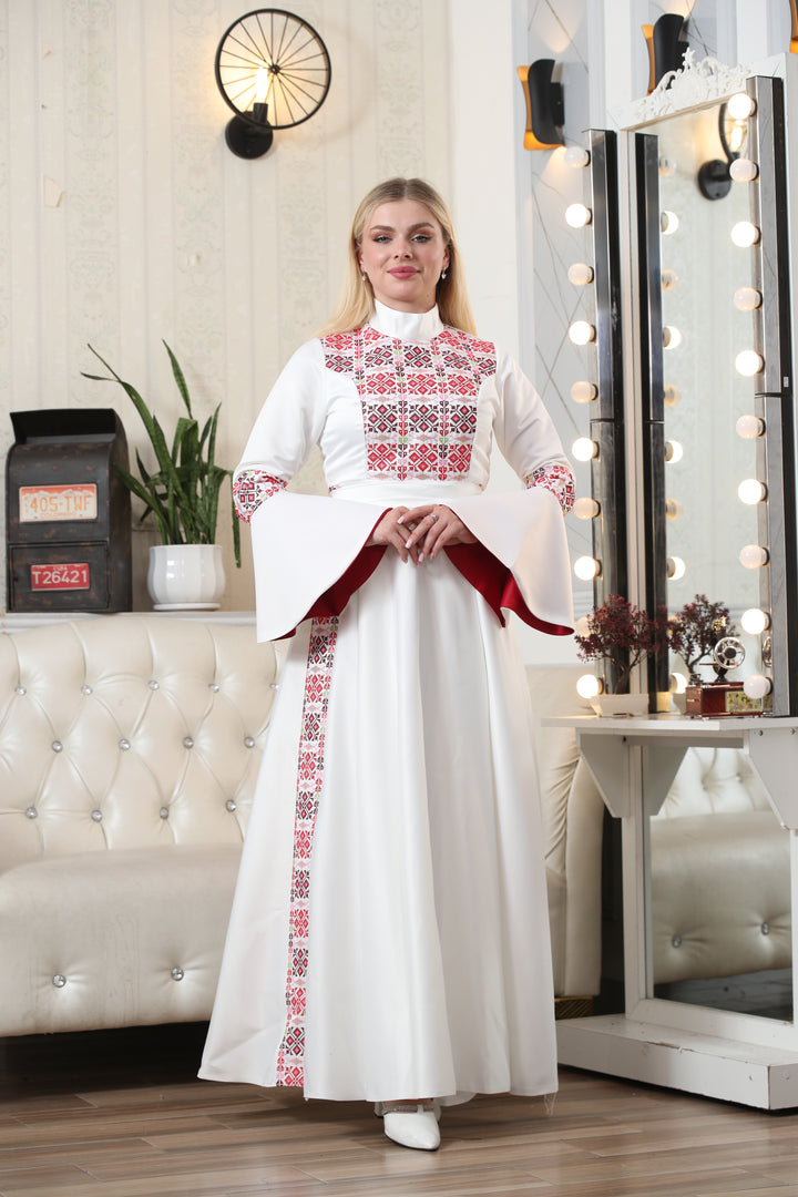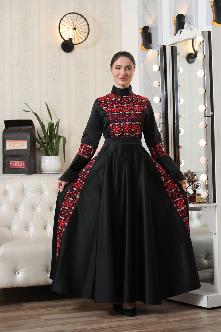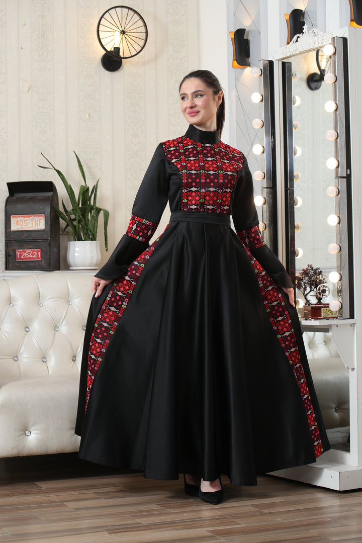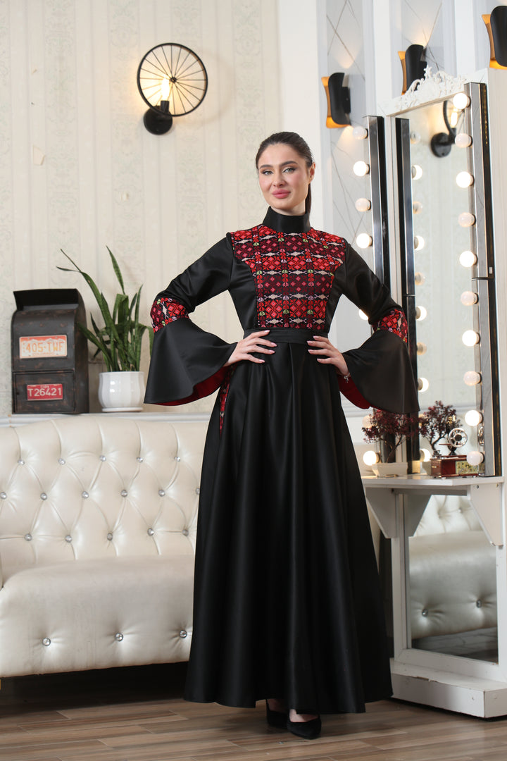This Embroidered Traditional Embroidered Occasion Dress – Rich Heritage Detailing & Refined Style #1097 is made in Jordan from the finest silk threads and the best fabrics ( satin taiwan ). It is a high-end piece of art designed to make you unique at your occasion.