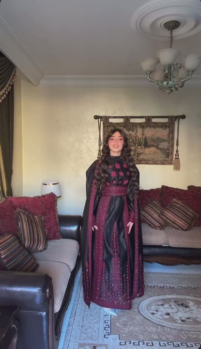 This Embroidered Handmade Jordanian-style dress with a headscarf #113 is made in Jordan from the finest silk threads and the best fabrics ( Satan ). It is a high-end piece of art designed to make you unique at your occasion.