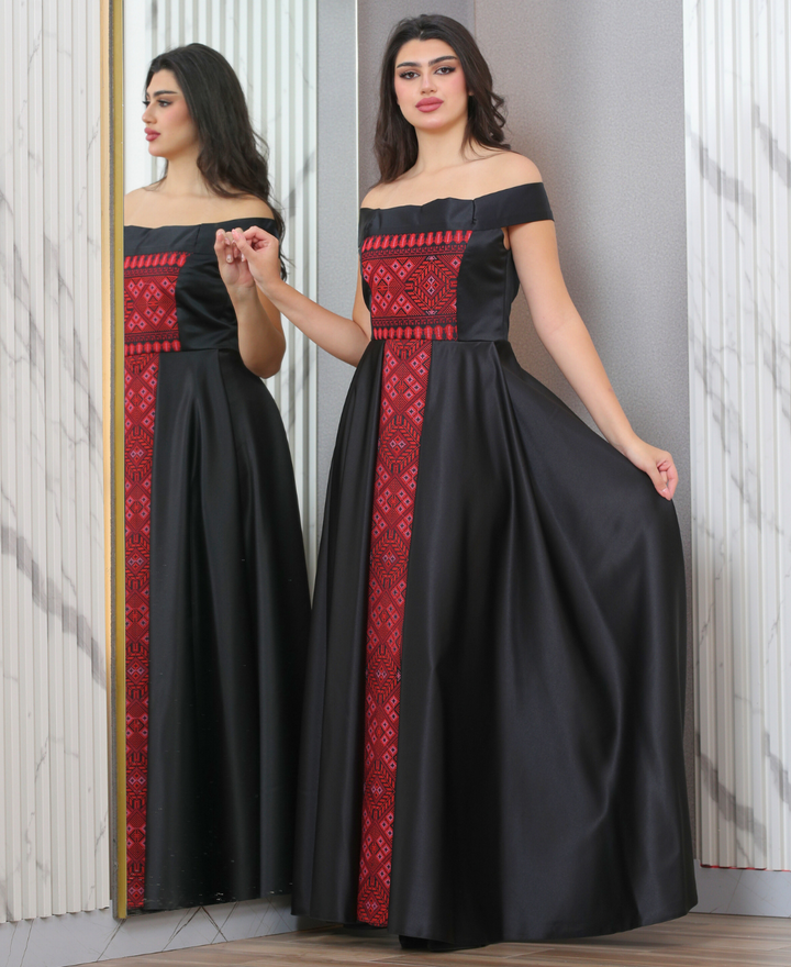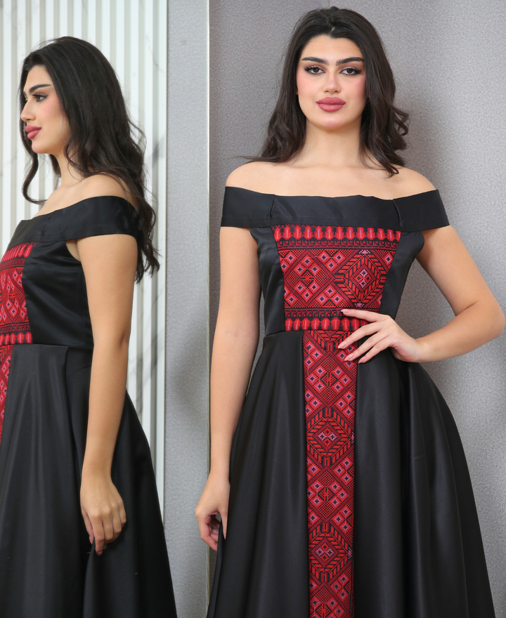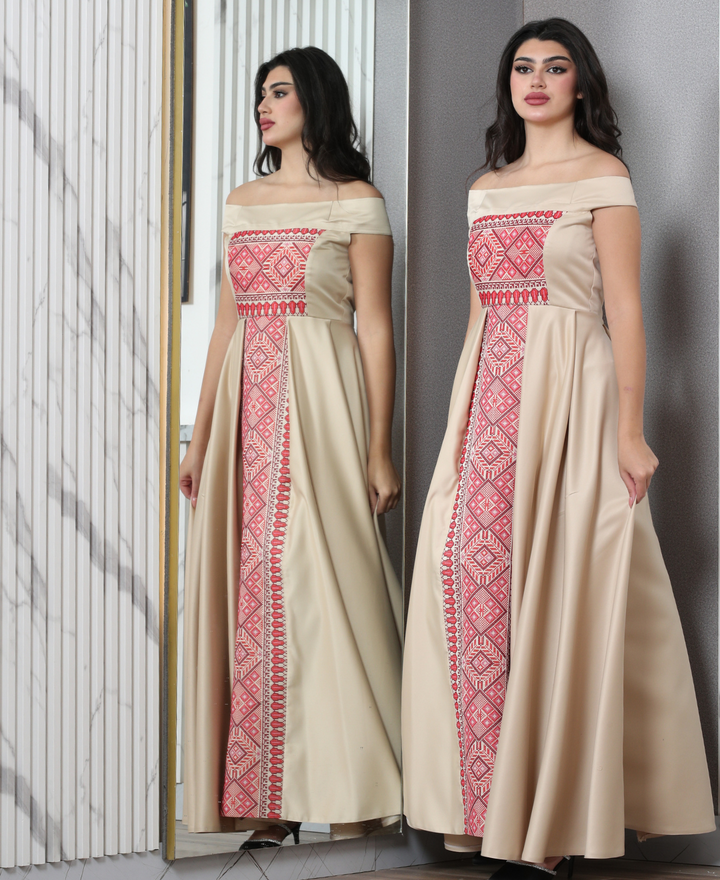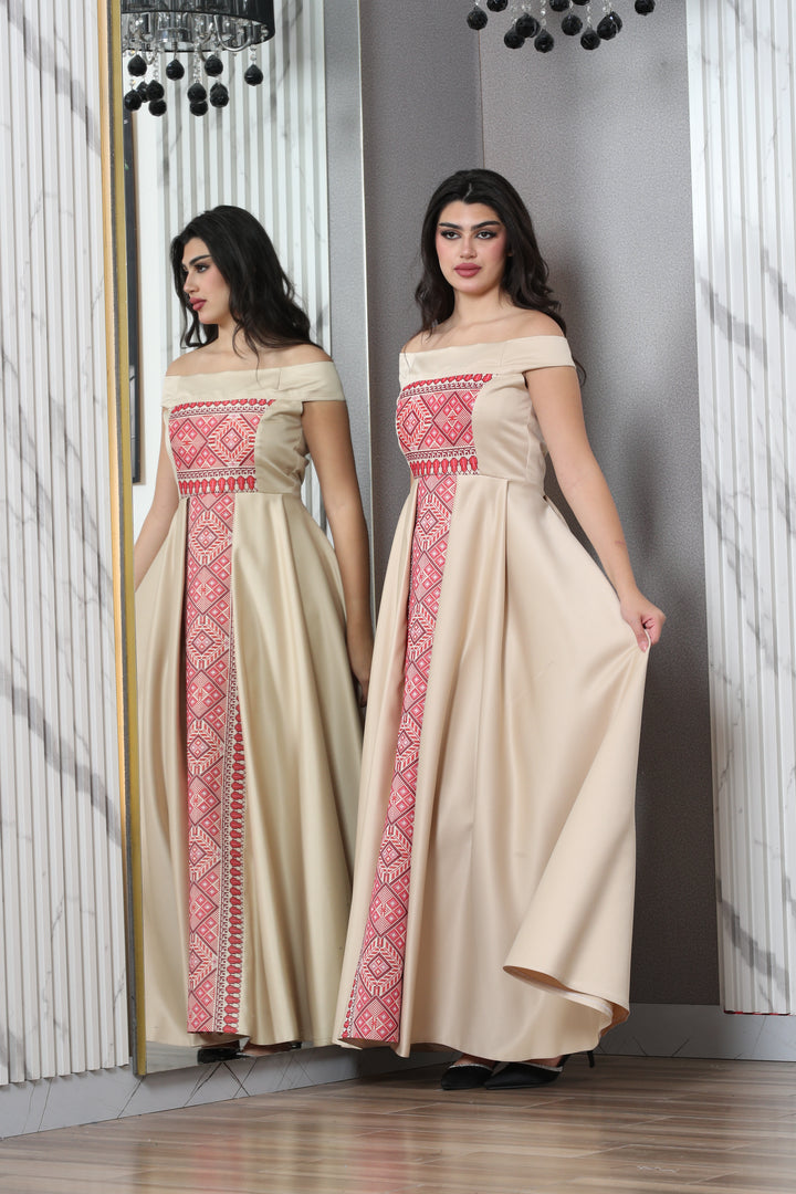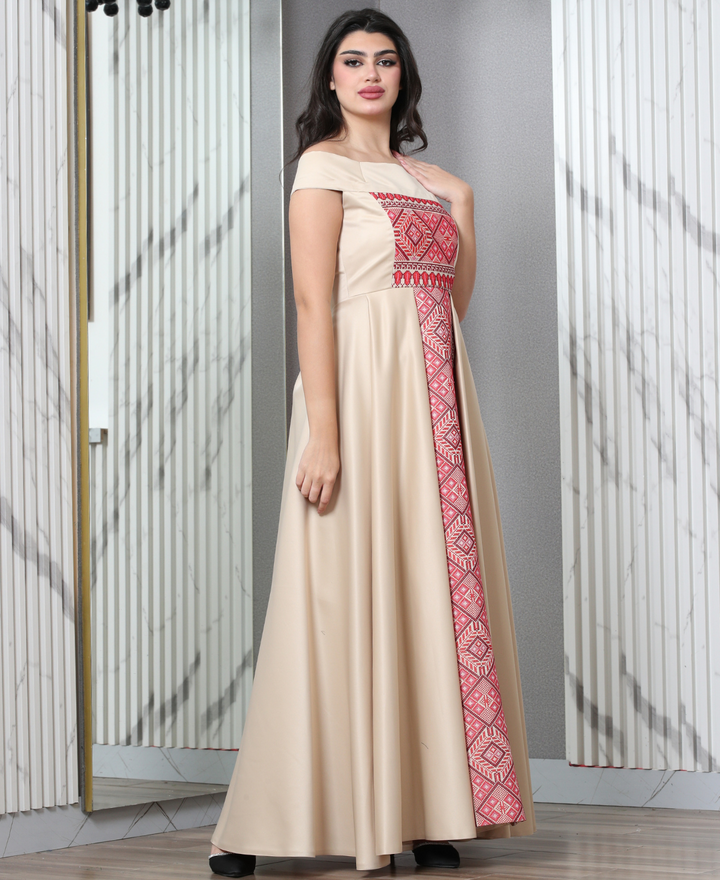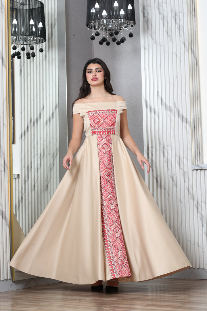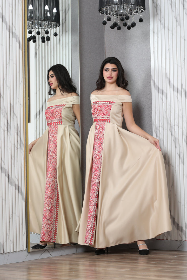 This Embroidered Elegant A-Line Dress with Signature Embroidered Panel #7 is made in Jordan from the finest silk threads and the best fabrics ( satin taiwan ). It is a high-end piece of art designed to make you unique at your occasion.