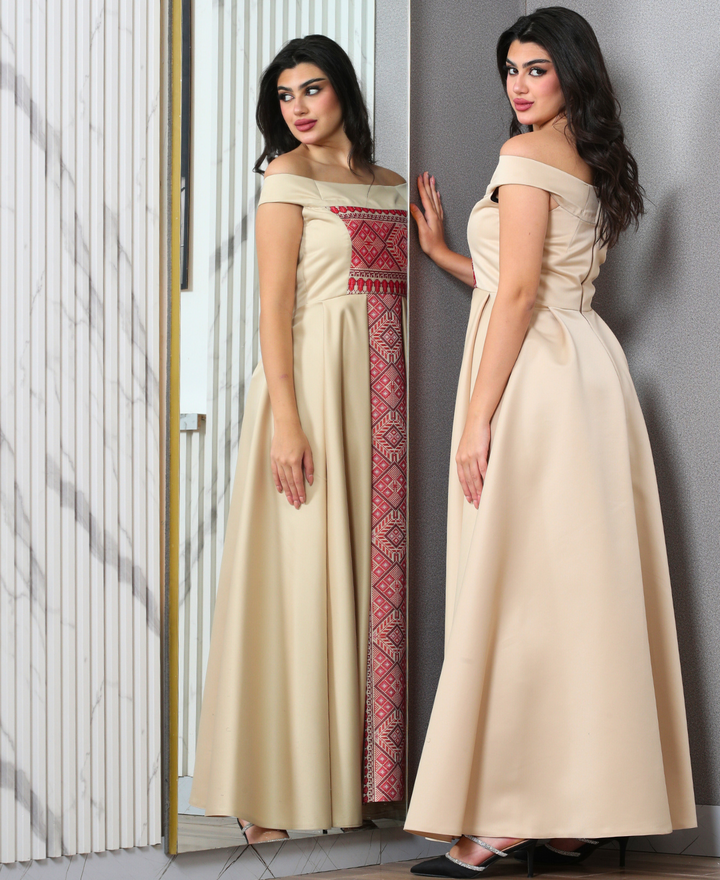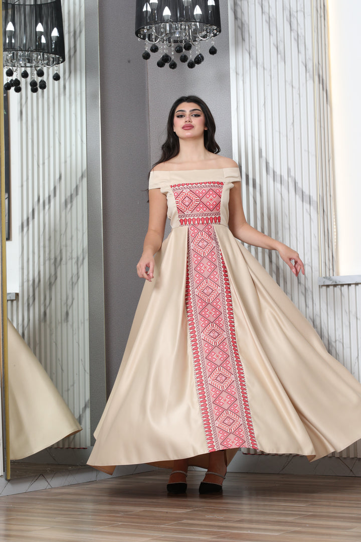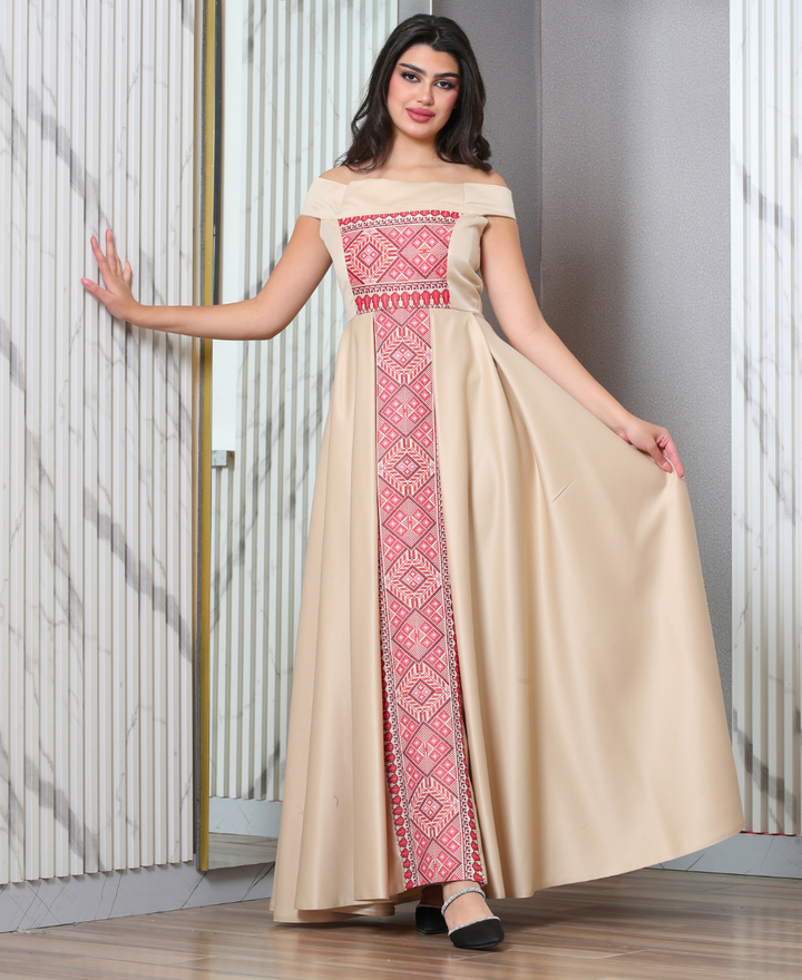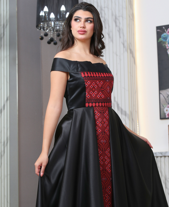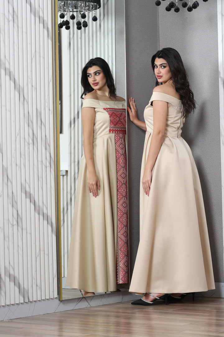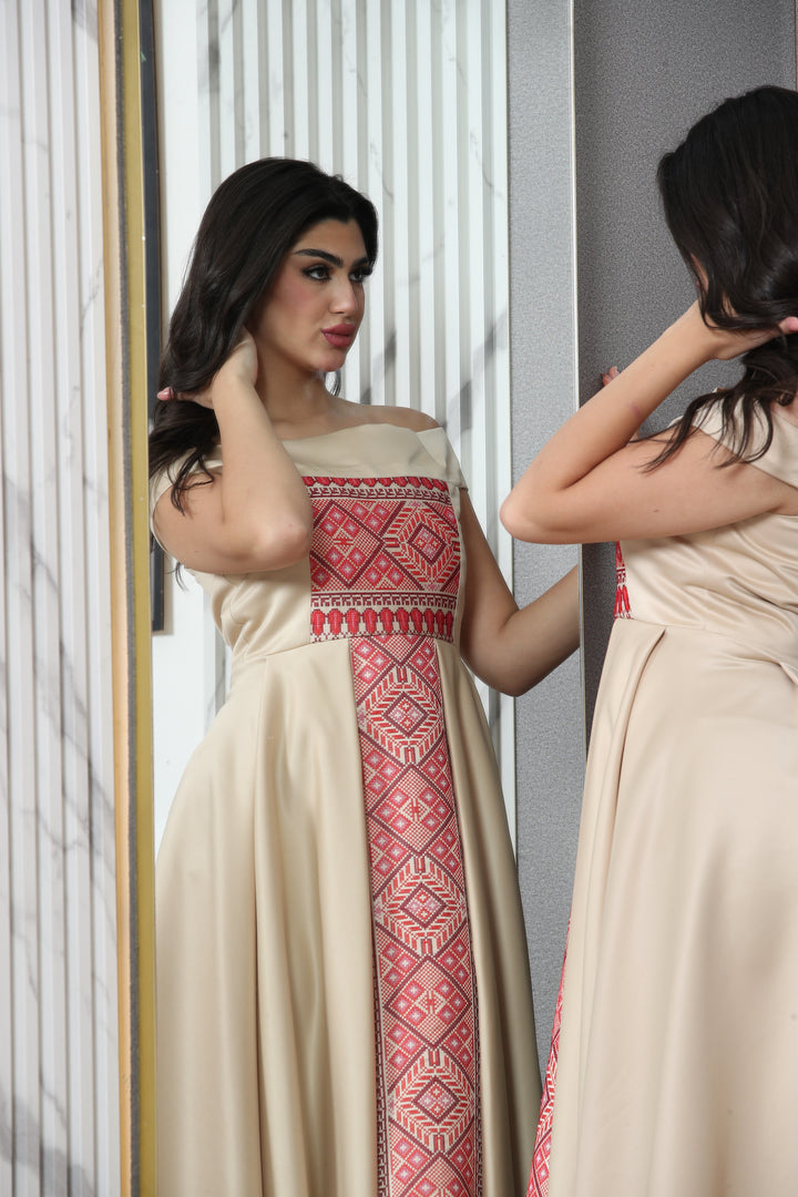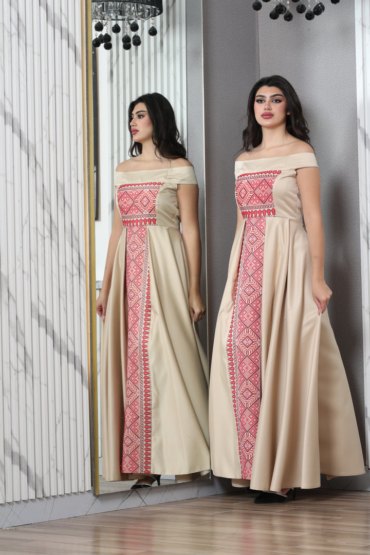 This Embroidered Elegant A-Line Dress with Signature Embroidered Panel #7 is made in Jordan from the finest silk threads and the best fabrics ( satin taiwan ). It is a high-end piece of art designed to make you unique at your occasion.
