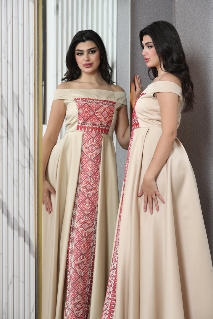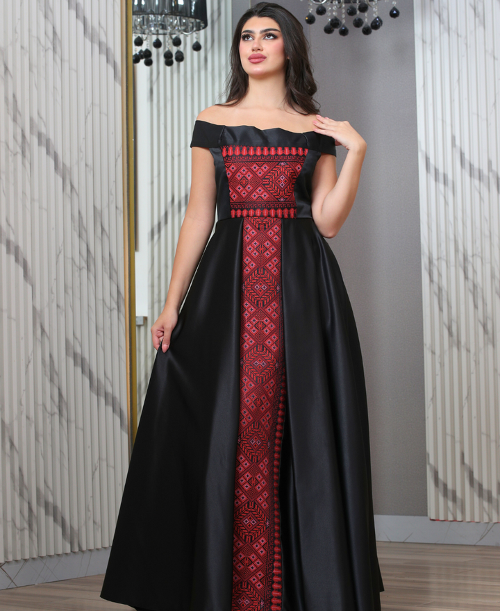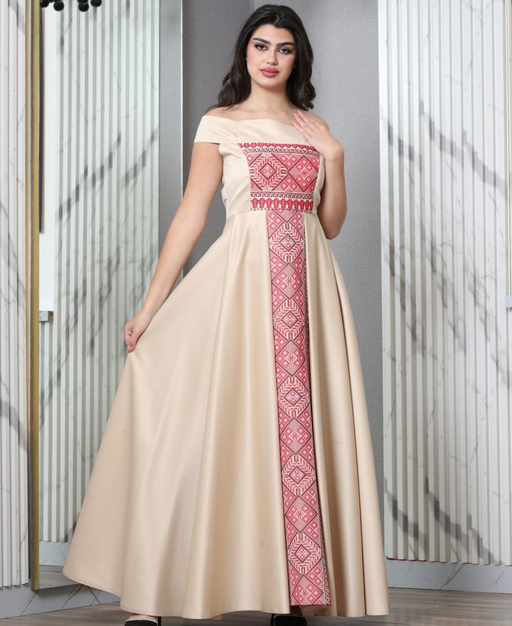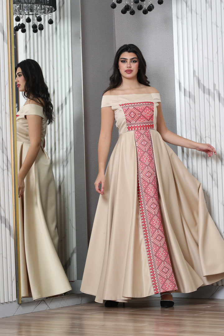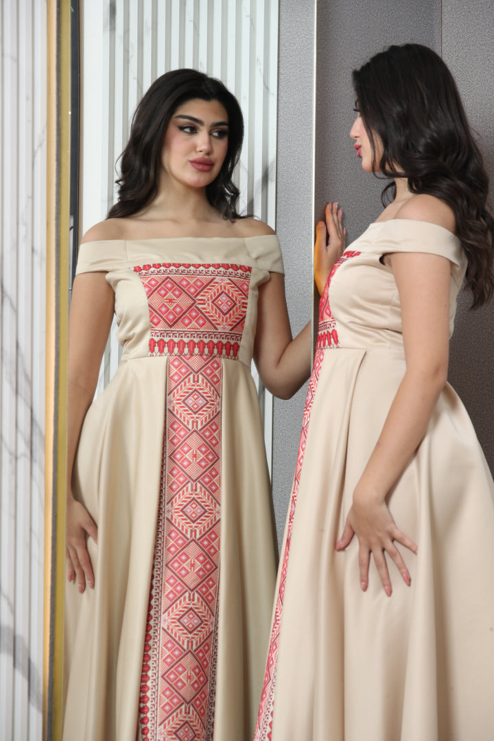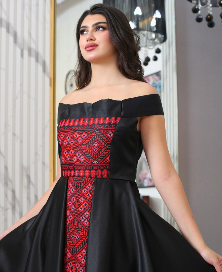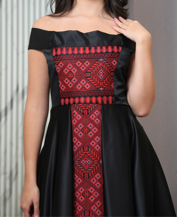 This Embroidered Elegant A-Line Dress with Signature Embroidered Panel #7 is made in Jordan from the finest silk threads and the best fabrics ( satin taiwan ). It is a high-end piece of art designed to make you unique at your occasion.