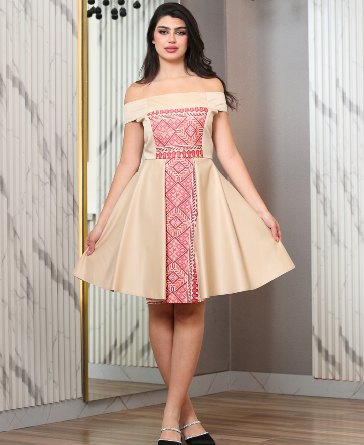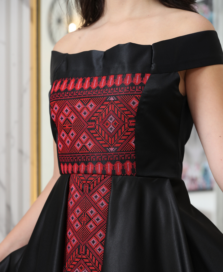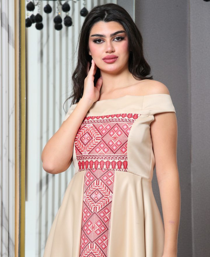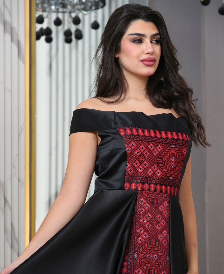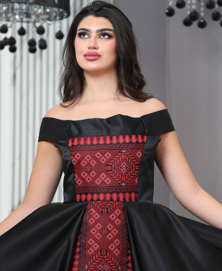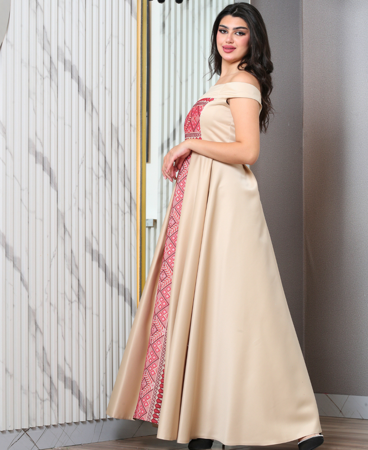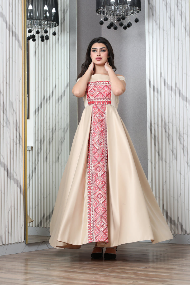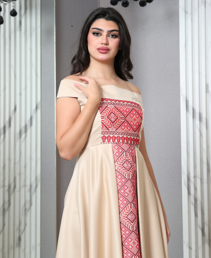 This Embroidered Elegant A-Line Dress with Signature Embroidered Panel #7 is made in Jordan from the finest silk threads and the best fabrics ( satin taiwan ). It is a high-end piece of art designed to make you unique at your occasion.