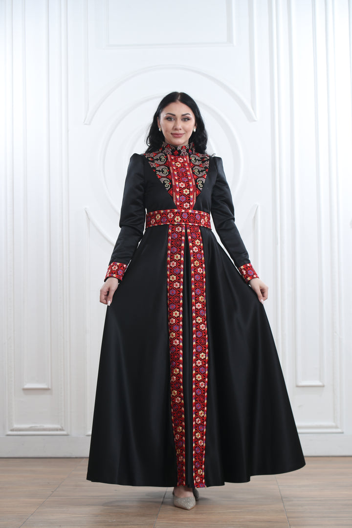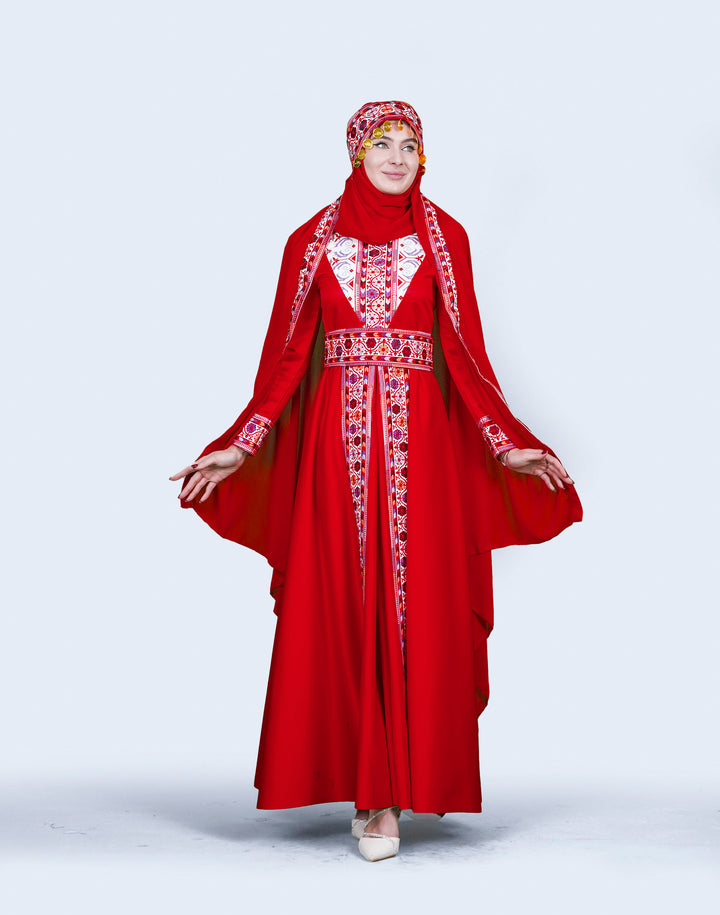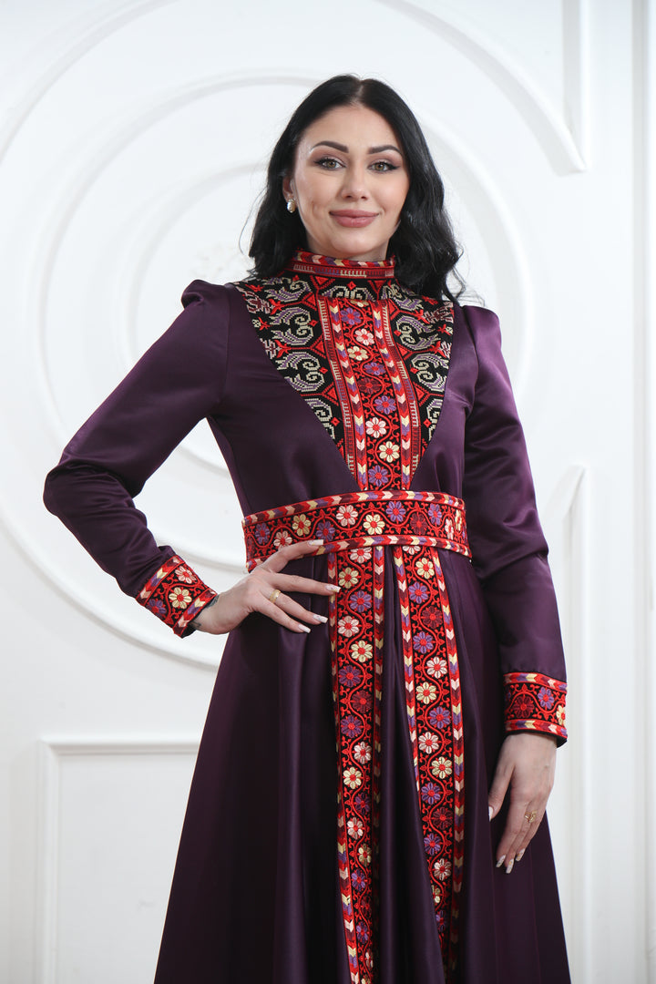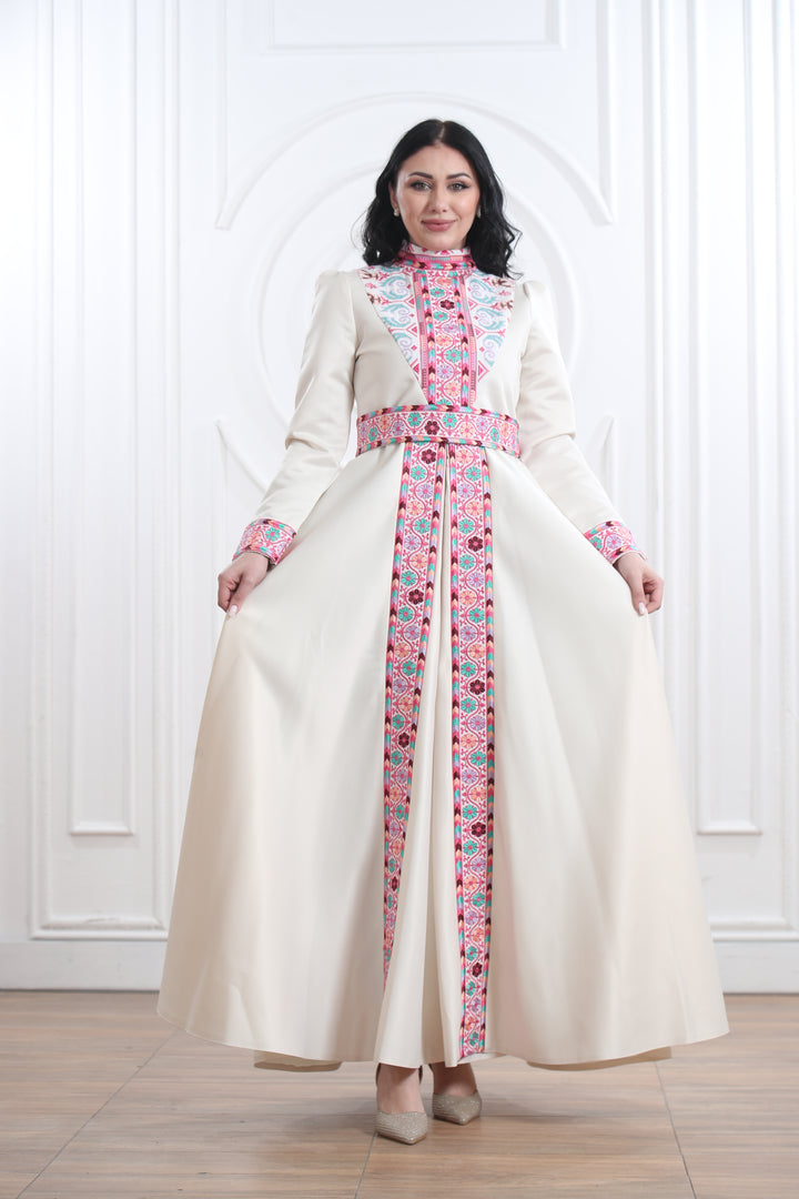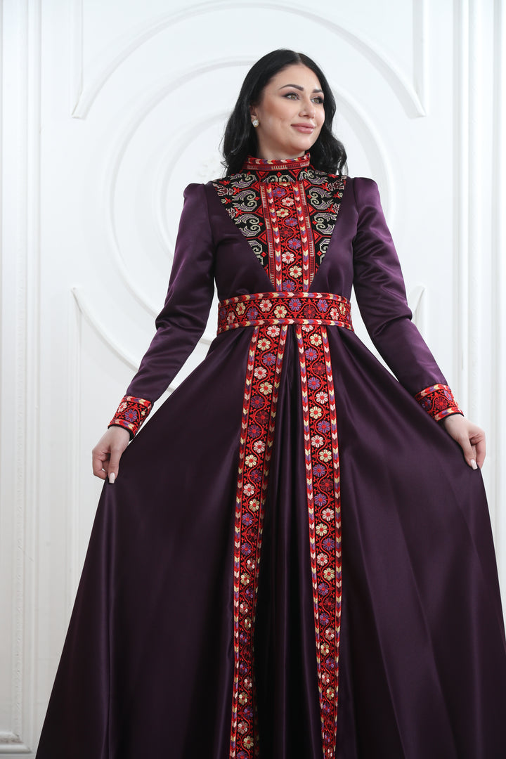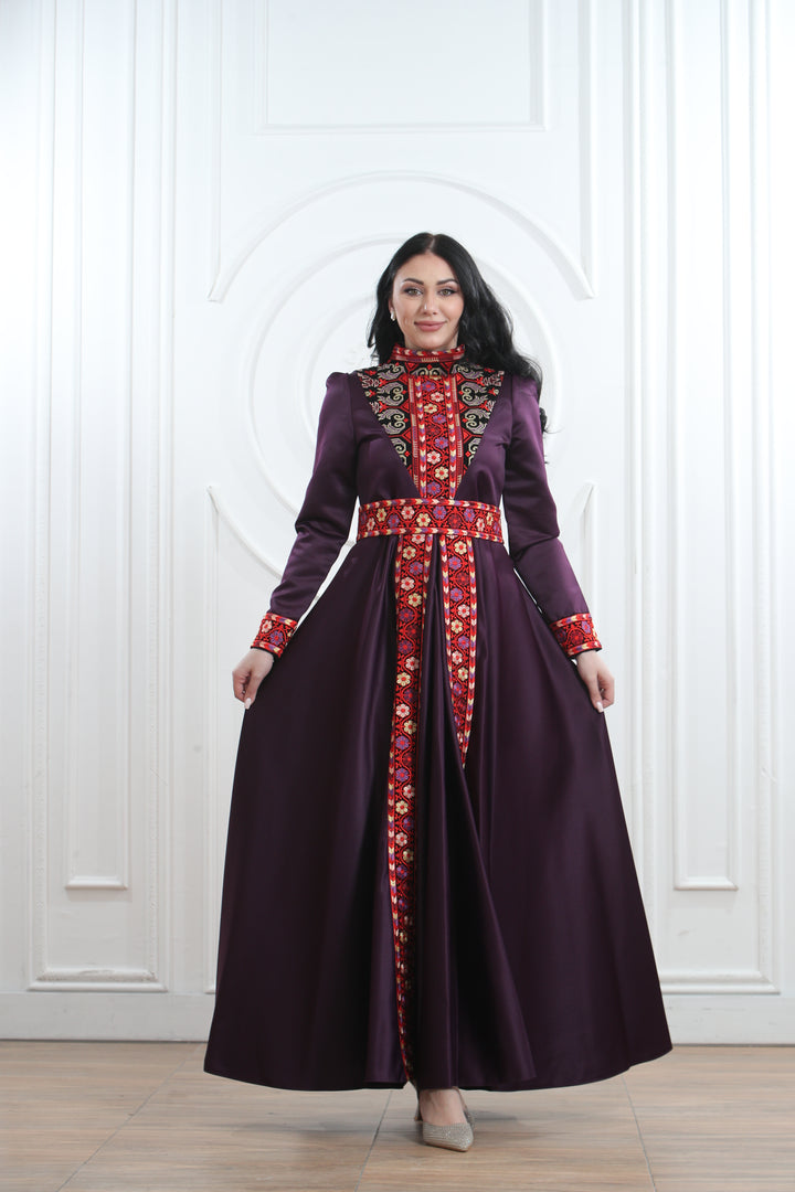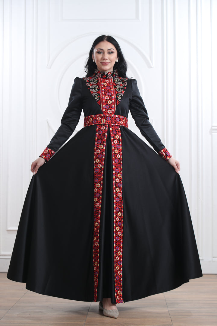 This Embroidered Heritage Bridal-Inspired Embroidered Dress with Full Cape Overlay #1086 is made in Jordan from the finest silk threads and the best fabrics ( satin taiwan ). It is a high-end piece of art designed to make you unique at your occasion.