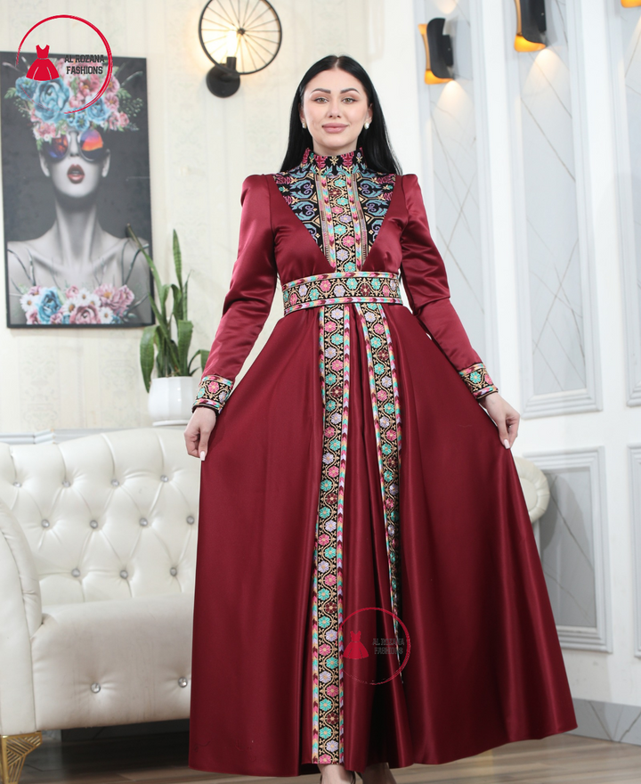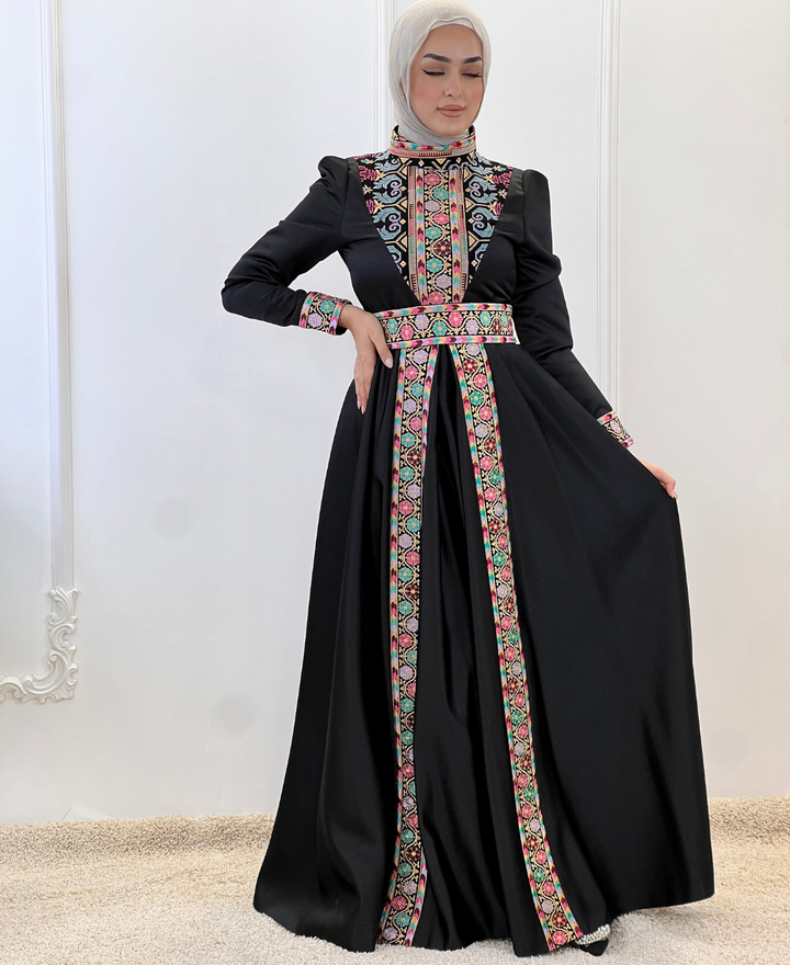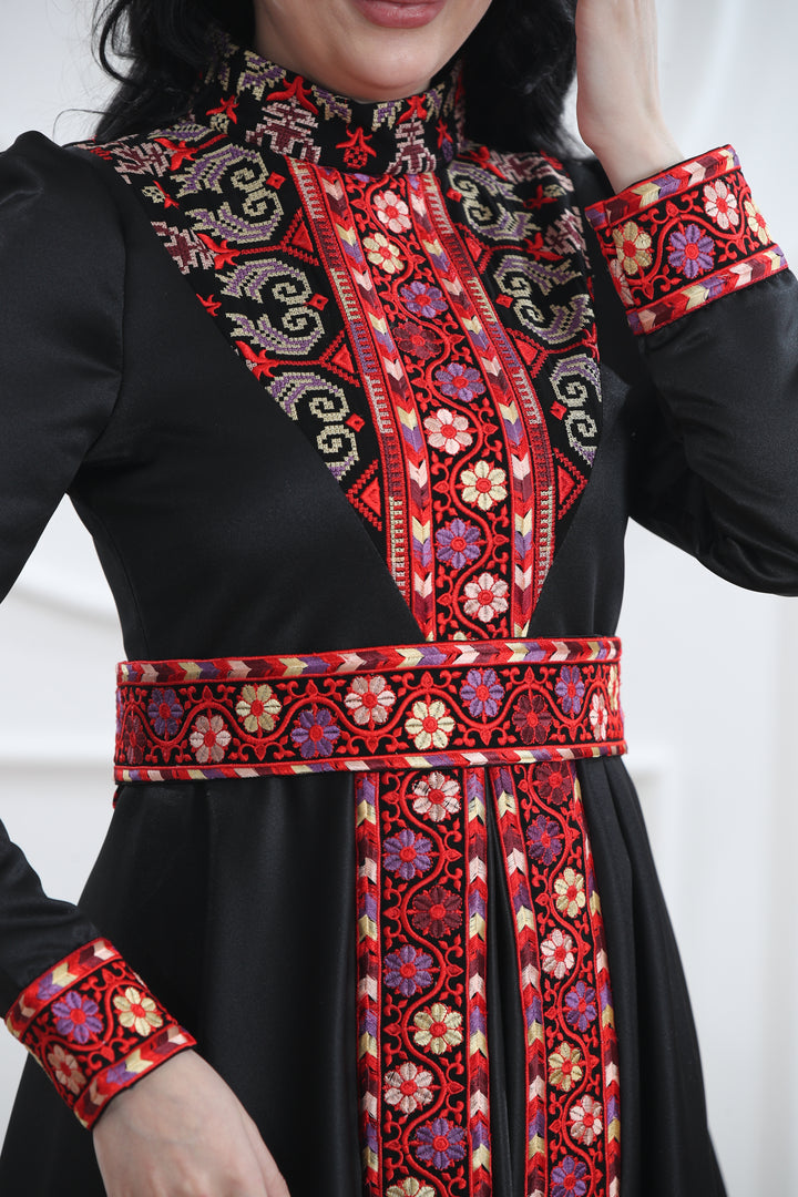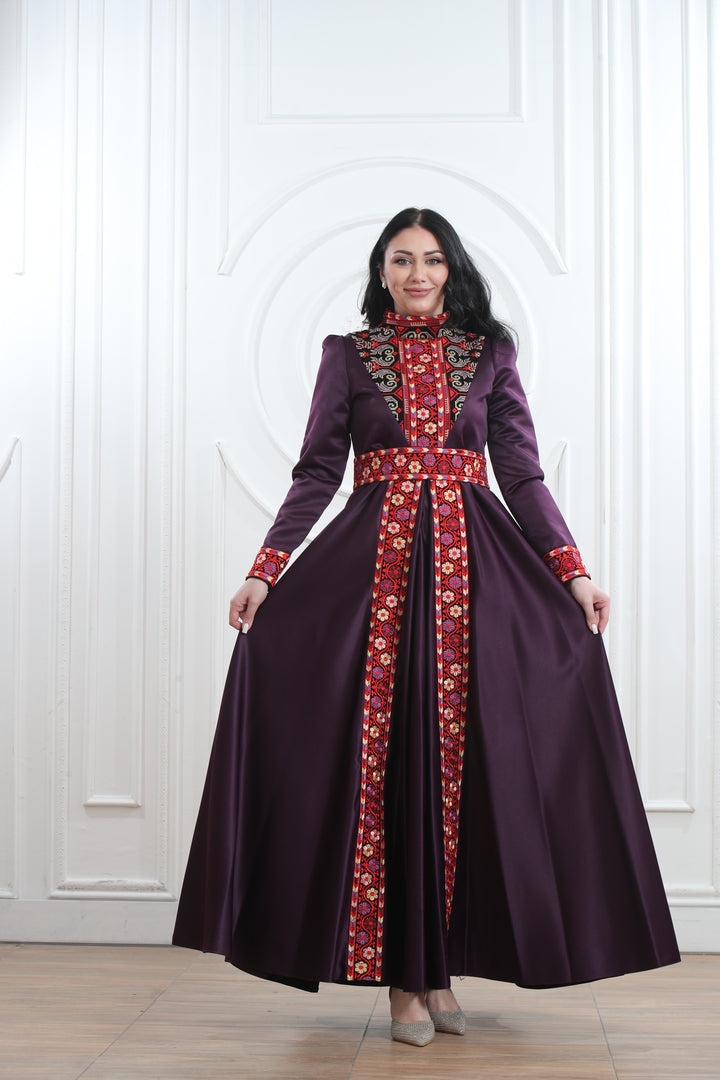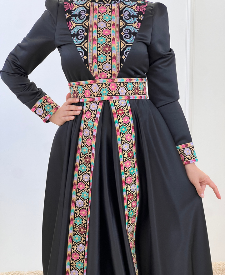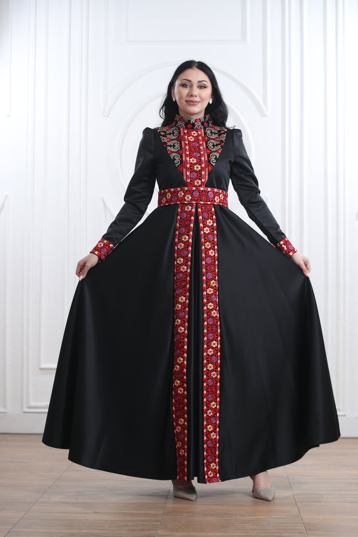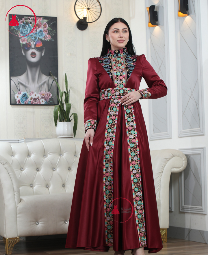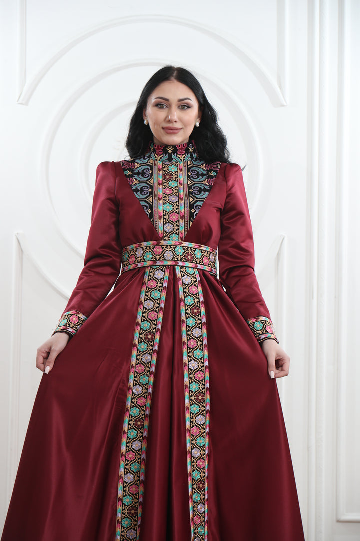 This Embroidered Heritage Bridal-Inspired Embroidered Dress with Full Cape Overlay #1086 is made in Jordan from the finest silk threads and the best fabrics ( satin taiwan ). It is a high-end piece of art designed to make you unique at your occasion.
