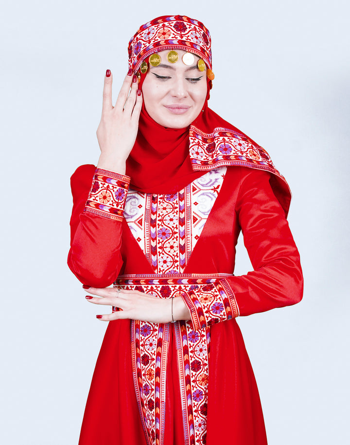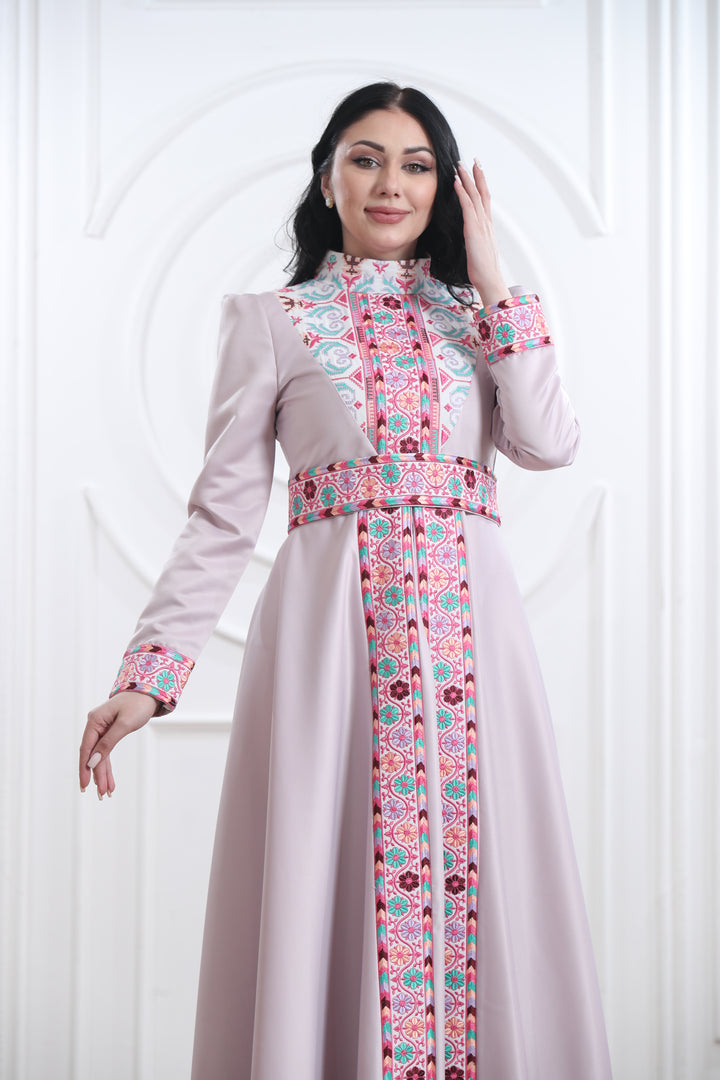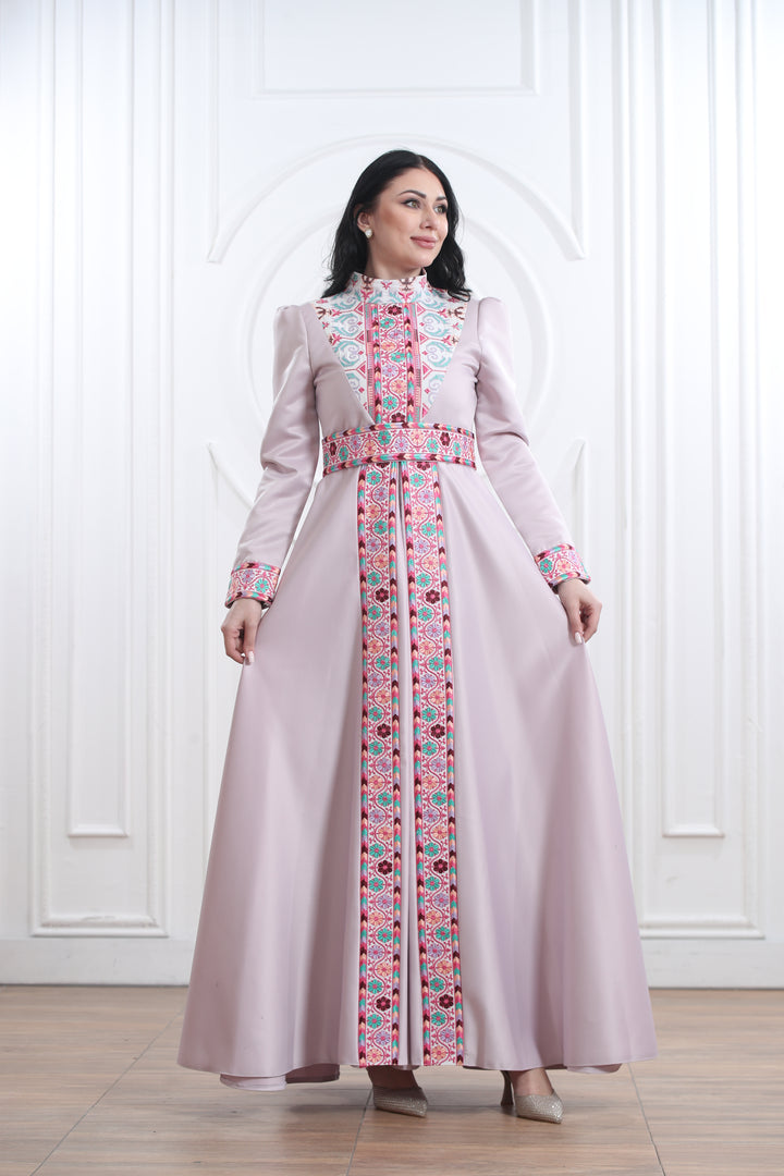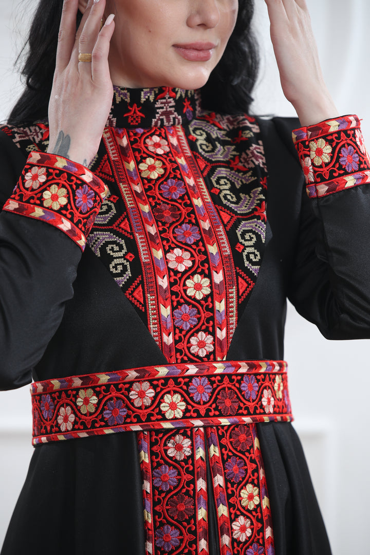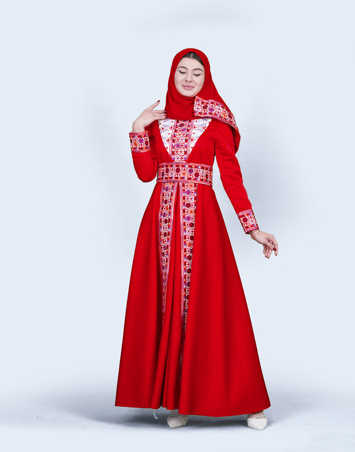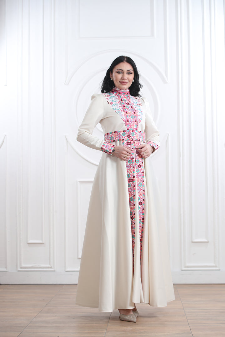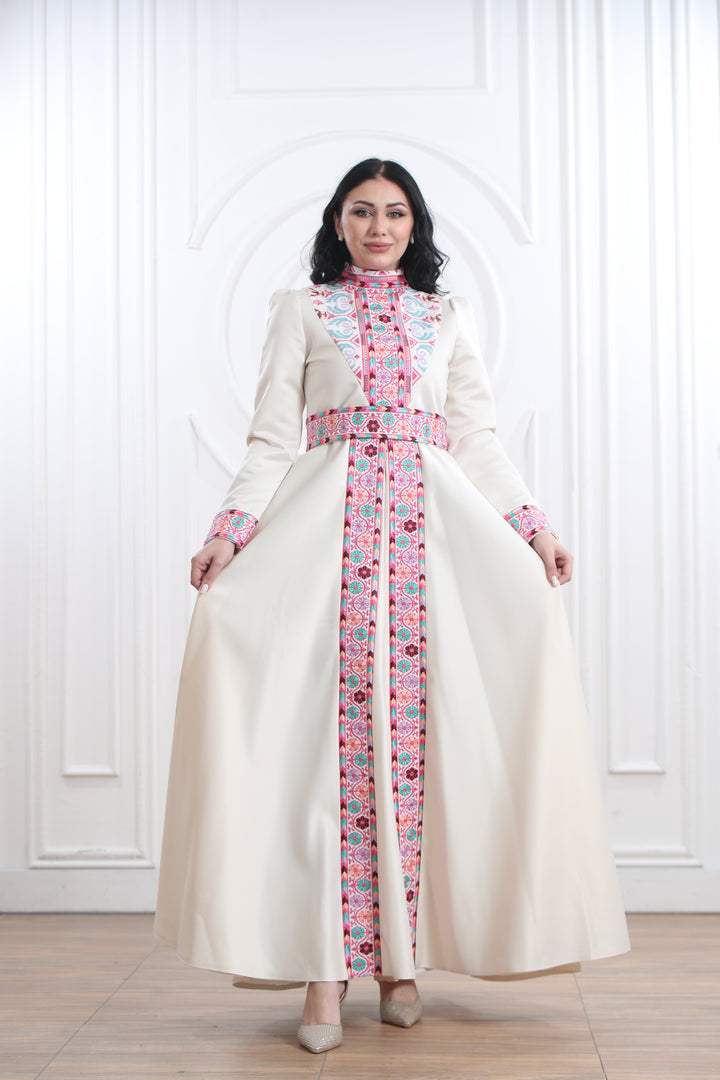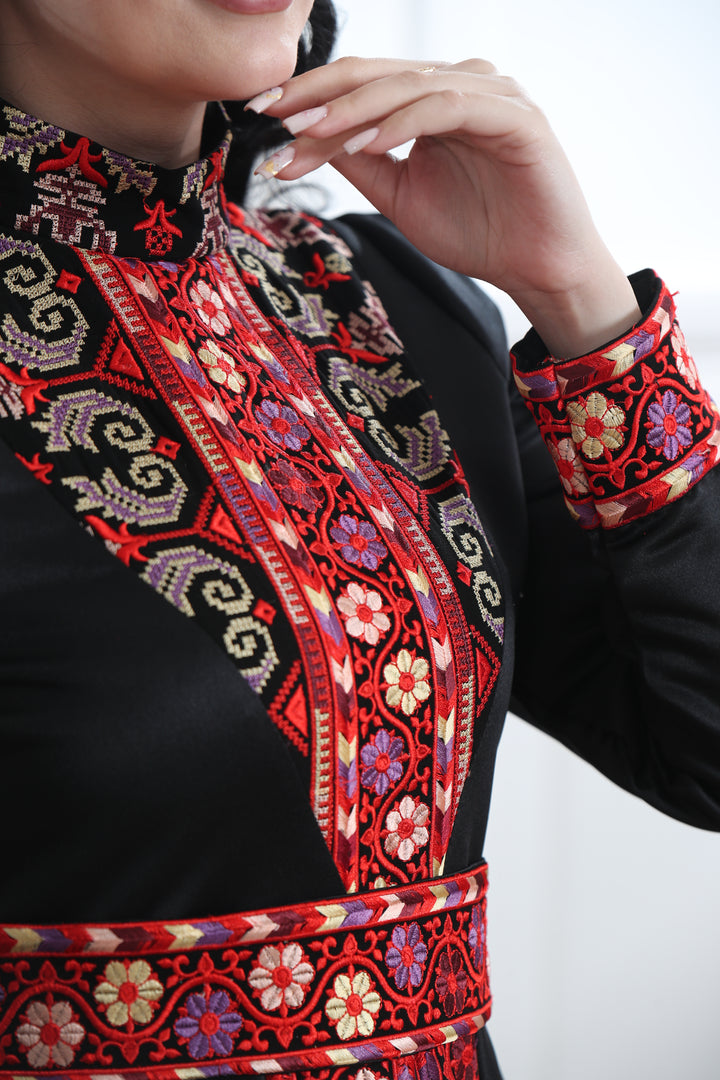 This Embroidered Heritage Bridal-Inspired Embroidered Dress with Full Cape Overlay #1086 is made in Jordan from the finest silk threads and the best fabrics ( satin taiwan ). It is a high-end piece of art designed to make you unique at your occasion.