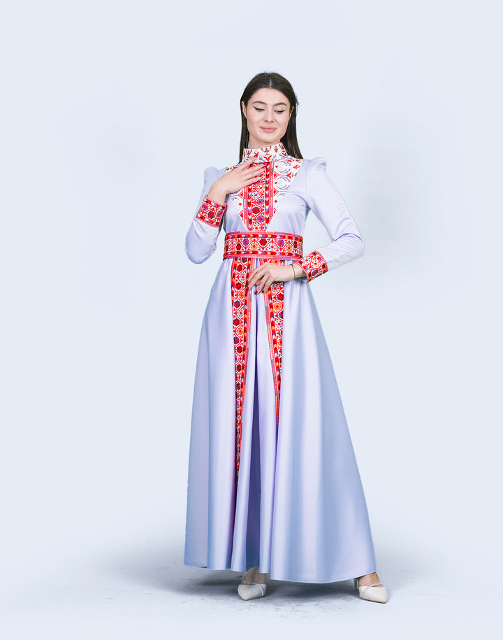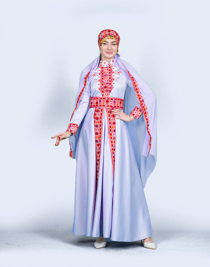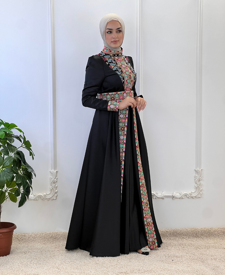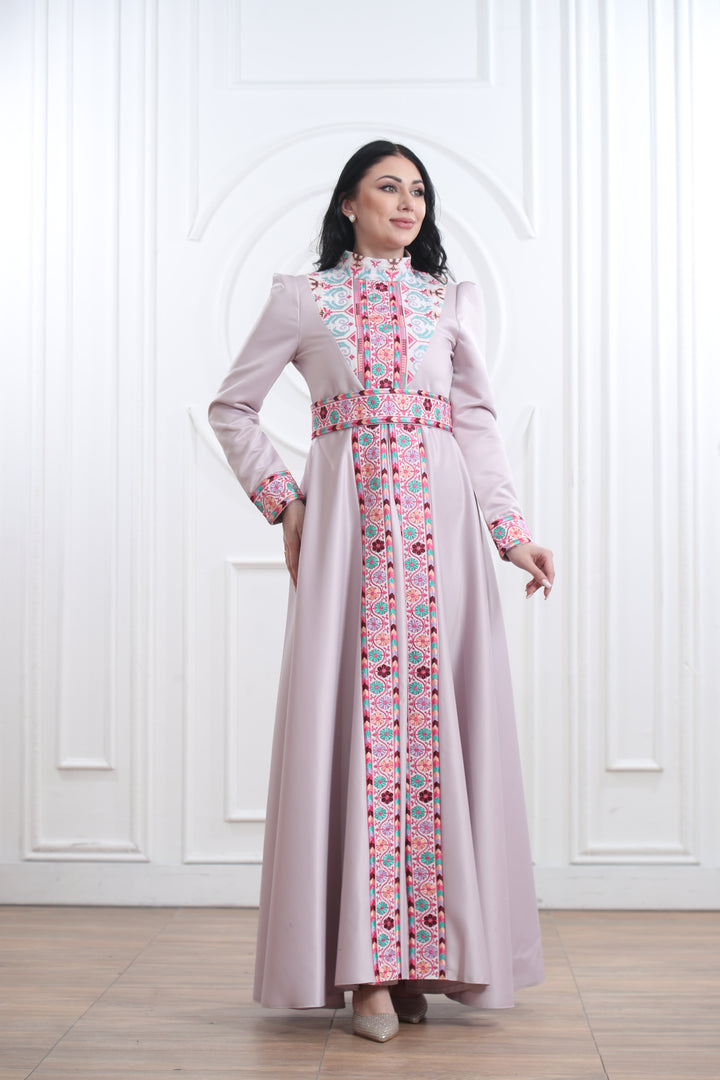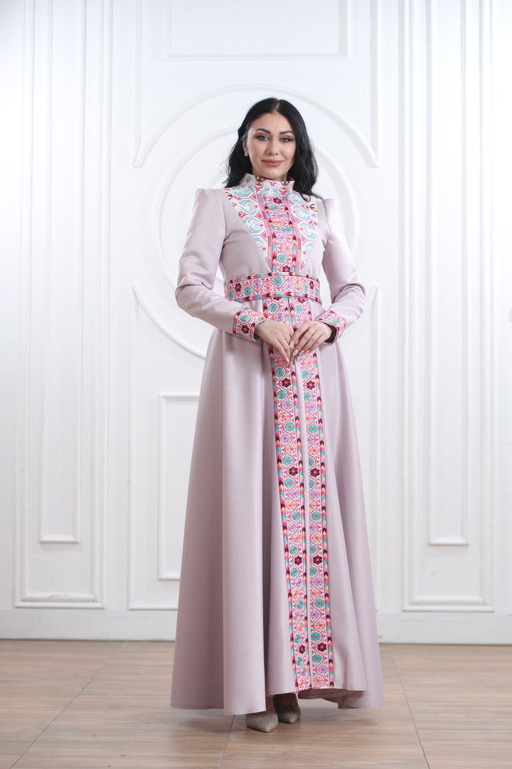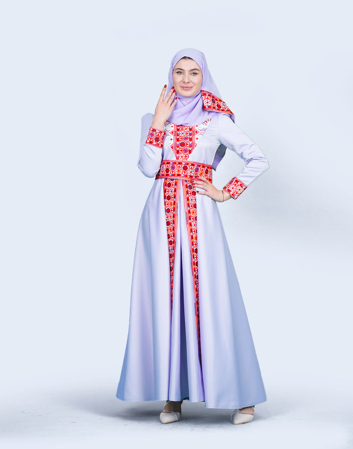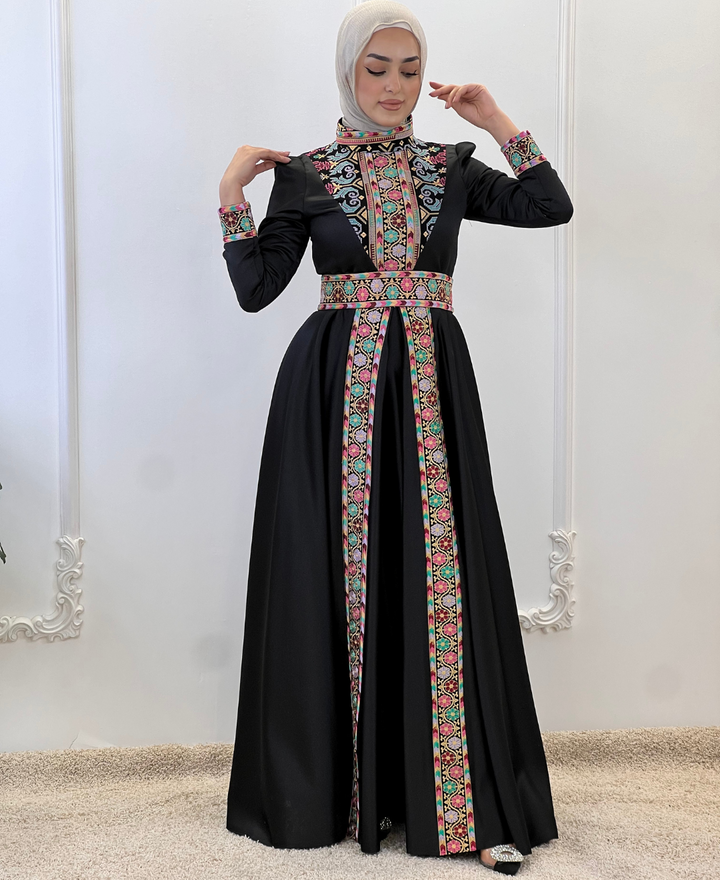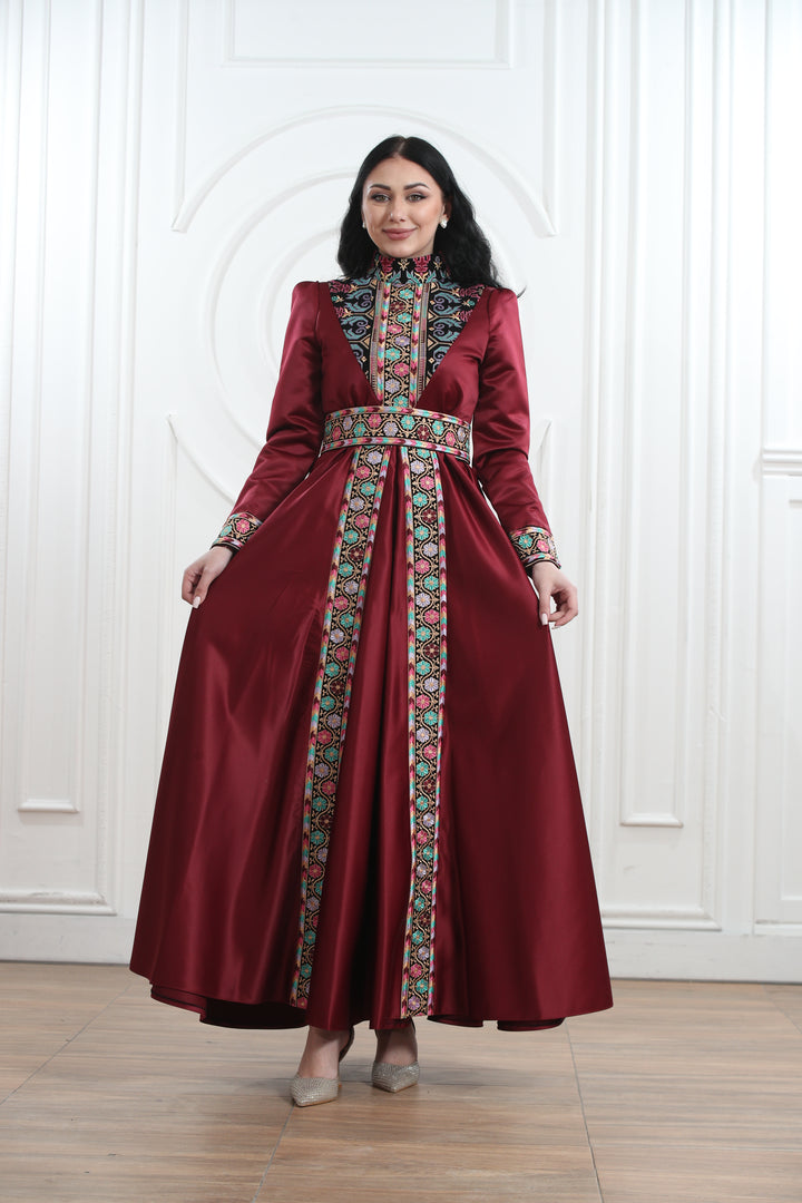 This Embroidered Heritage Bridal-Inspired Embroidered Dress with Full Cape Overlay #1086 is made in Jordan from the finest silk threads and the best fabrics ( satin taiwan ). It is a high-end piece of art designed to make you unique at your occasion.
